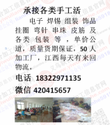 承接串珠,钉珠,弯针,挂圈,胶枪,打结编织,包装,组装等手工活,我们赶货及时质量保证,诚心期待与您合作,地址:江西省抚州