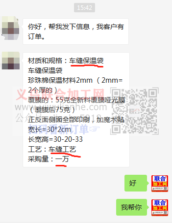 10000车缝保温袋订单外发,寻找工厂,材质和规格:车缝保温袋