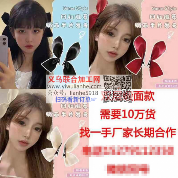 10万网红爆款发夹订单外发,如图,寻找一手厂家,长期合作的,需要10万货,双层缎面款,电话联系详谈