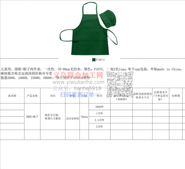 有围裙帽子套装平车活外发,如图,