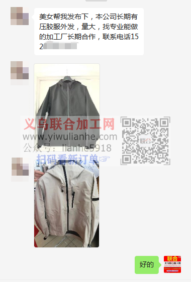 老板在线等:本公司长期有压胶服外发,量大,找专业能做的加工厂长期合作