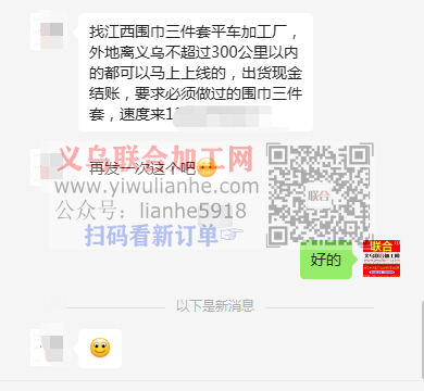 加工厂,外地离义乌不超过300公里以内的都可以马上上线的,出货现金结账,要求必须做过的围巾三件套,速度来