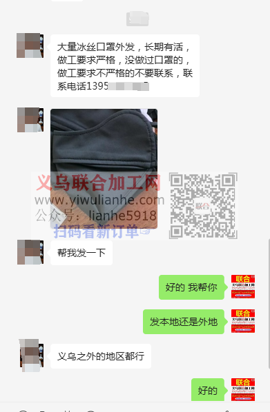 【发外地】大量冰丝口罩外发,长期有活,做工要求严格,没做过口罩的,做工要求不严格的不要联系,义乌之外的地区都行,联系电话详谈