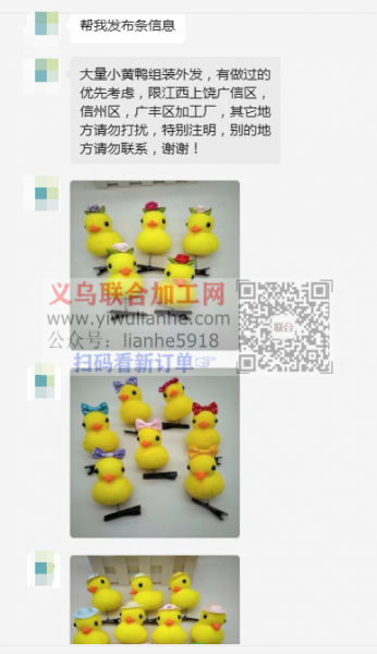 老板在线等:大量小黄鸭组装外发,有做过的优先考虑,限江西上饶广信区,信州区,广丰区加工厂,其它地方请勿打扰,特别注明,别的地方请勿联系,谢谢!不要打电话,微信联系