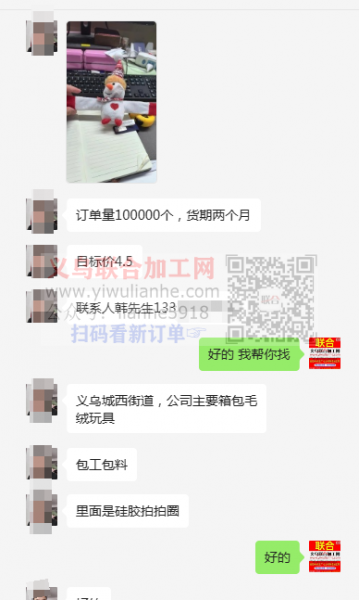 公司10万订单外发,毛绒玩具啪啪圈,订单量100000个,货期两个月,包工包料,目标价4.5,里面是硅胶拍拍圈,义乌城西街道,公司主要做箱包毛绒玩具,联系人韩先生