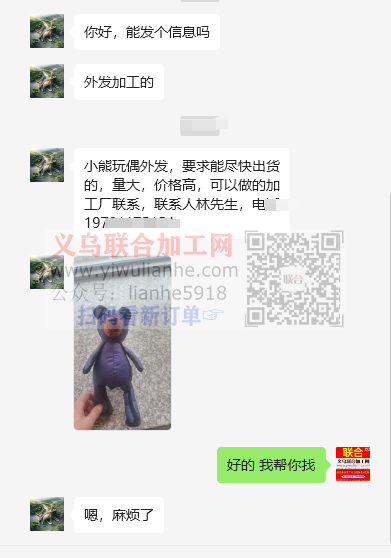 大量小熊玩偶外发,要求能尽快出货的,量大,价格高,可以做的加工厂联系,联系人林先生