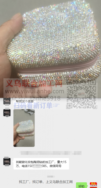 【老板在线等】找能做化妆包陶泥钻的加工厂,量大15万,电话微信同号