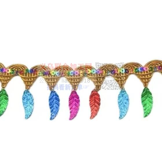 寻找花边成品如图,金色 宽2.7cm 40坠 长9米 长期需求,有优势的联系:
