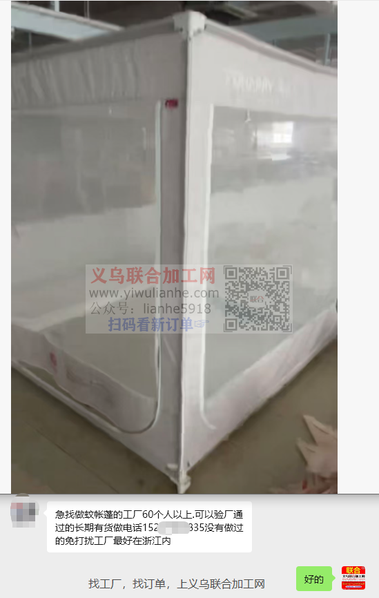 急找做蚊帐篷的工厂,60个人以上,可以验