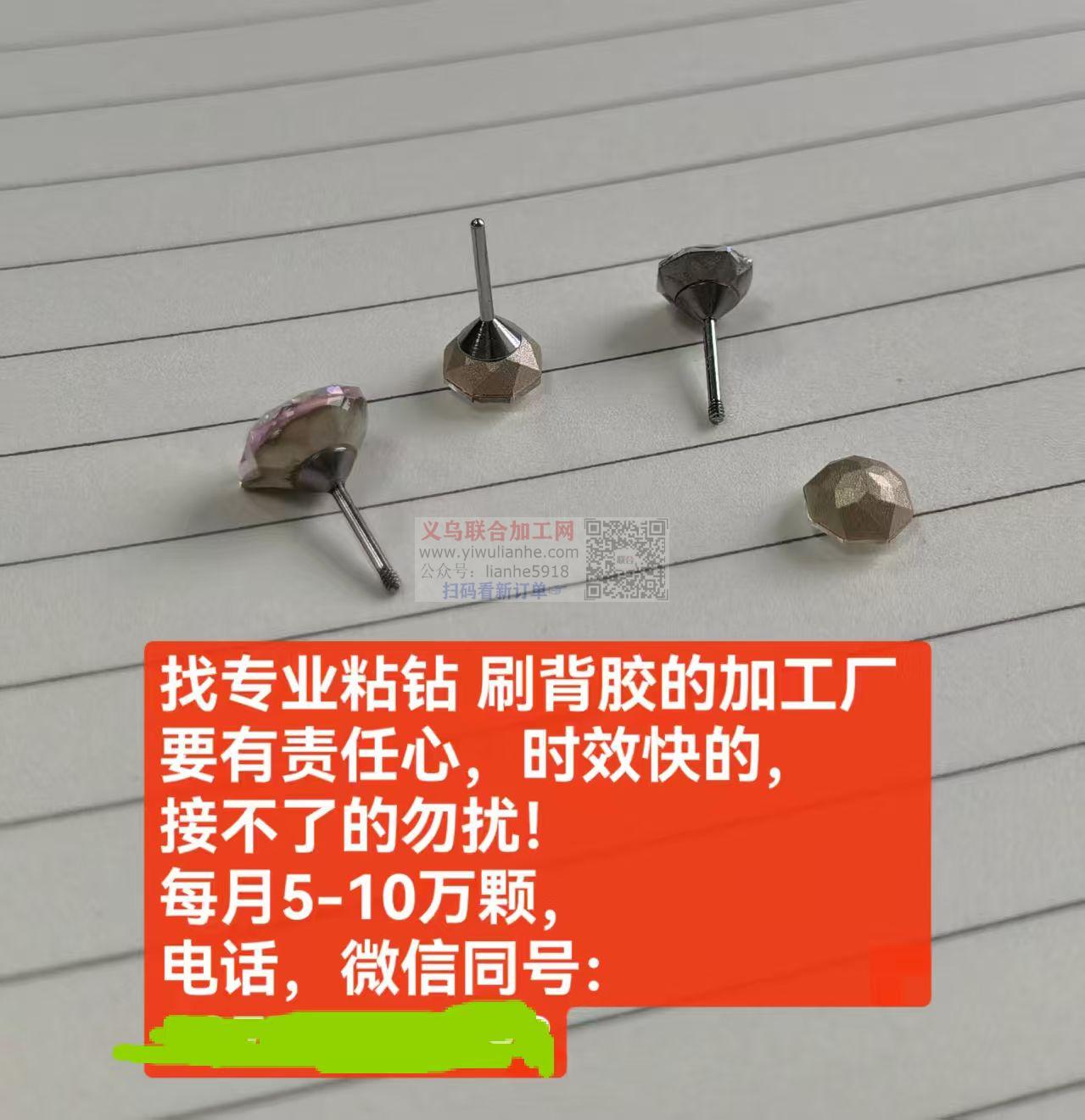 ,找专业粘钻刷背胶的加工厂要有责任心,时效快的,接不了的勿扰!每月5-10万颗,电话,微信同号: