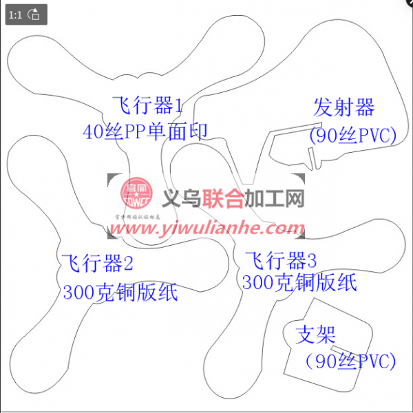 300万套如图订单外发。如图5个配件为一套:飞行器按9CM直径(飞行器1用40丝PP材料单面4色印刷,飞行器2和3用300克的铜板纸双面四色印刷) 发射器按70X55MM报 发射器跟支架按90丝PVC报
