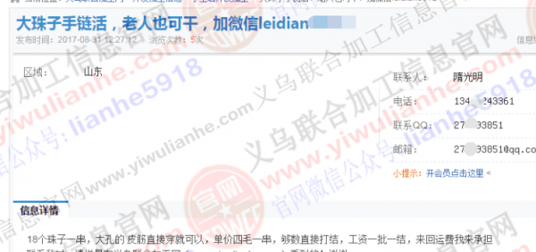 通告134....3361串珠子外发是骗押金 某山东骗子在网站发布串珠子手工活外发信息,经核实为骗子,收取押金,信息已处理,请联系大家注意。谨慎合作,号码是134....3361